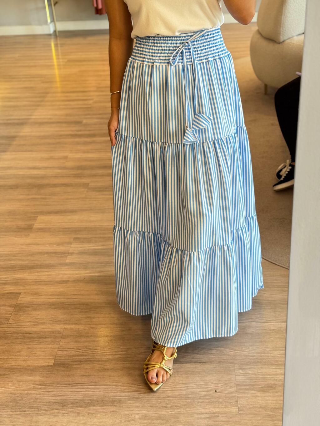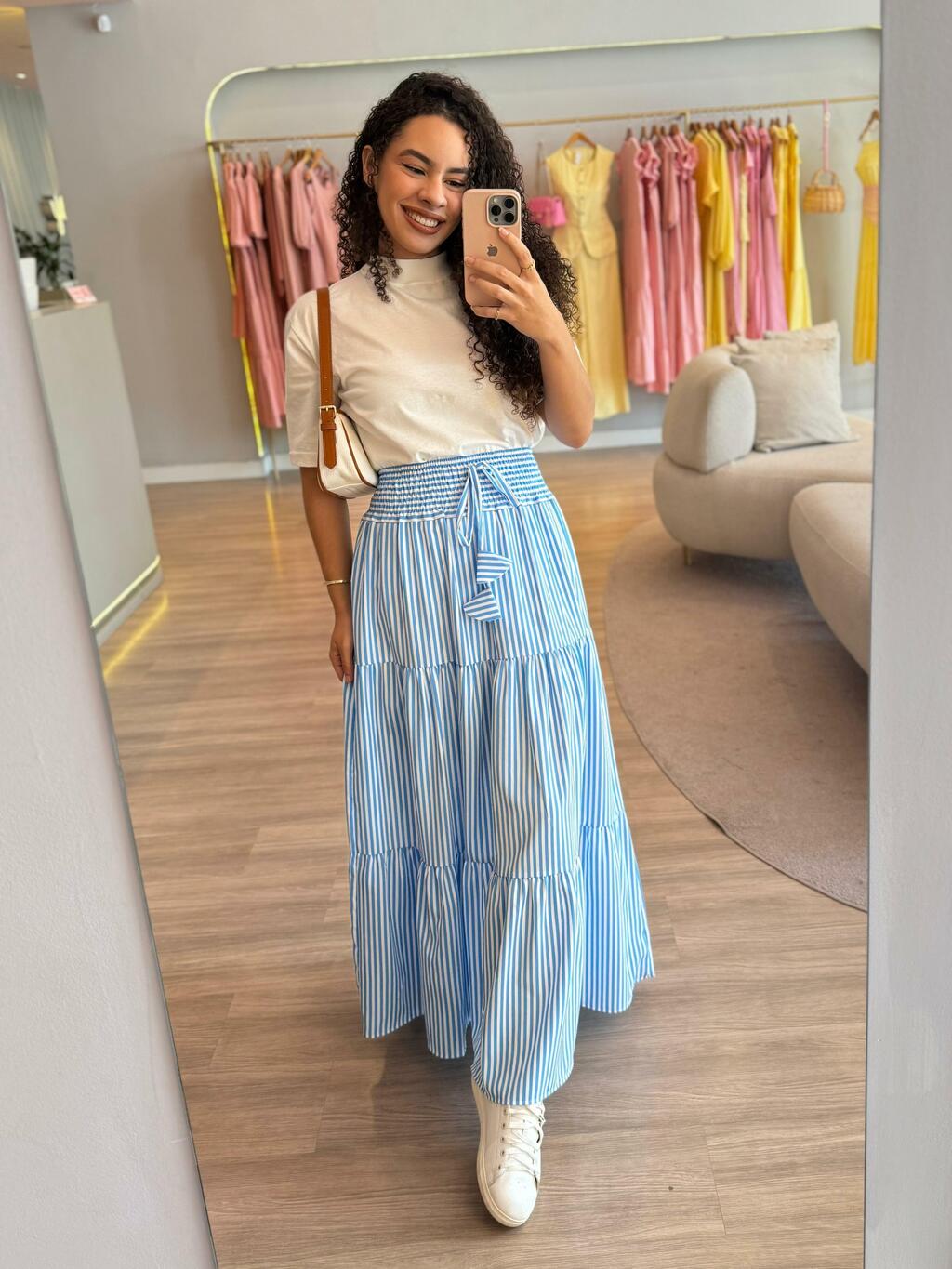 Essa saia listrada é a escolha perfeita para dias ensolarados — com cores vibrantes, modelagem soltinha e aquele toque alegre que transforma qualquer look.