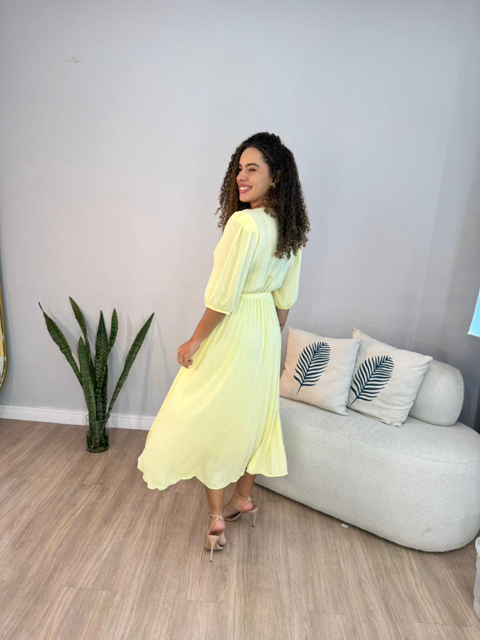 Modelo em crepe com detalhes de plissados na saia, com mangas bufantes, e acompanha uma faixa, ele tem elastex na cintura , perfeito para você arrasar em varias ocasiões.