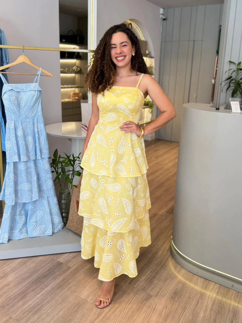 Brilho próprio em cada camada! Esse vestido amarelo com camadas leves e estampa delicada é o match perfeito entre frescor e elegância. Perfeito para dias ensolarados ou momentos que pedem um toque de alegria e estilo.