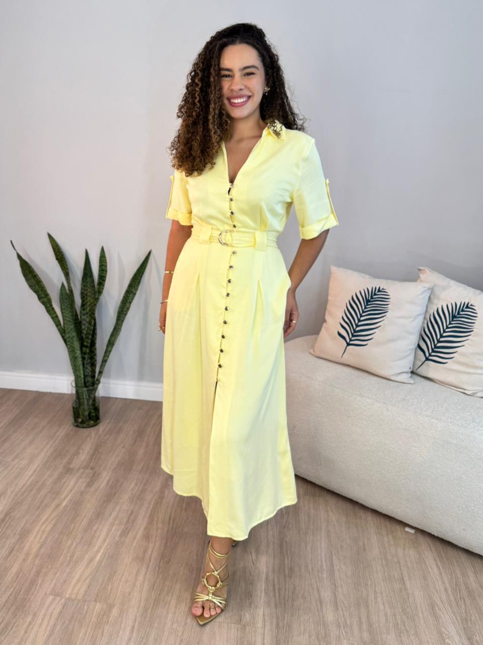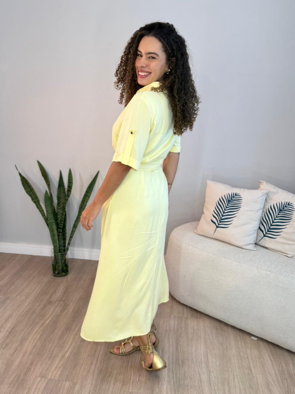A chemise em tecido estruturado, com botões e faixa, é a escolha certa pra um look elegante e cheio de presença.
