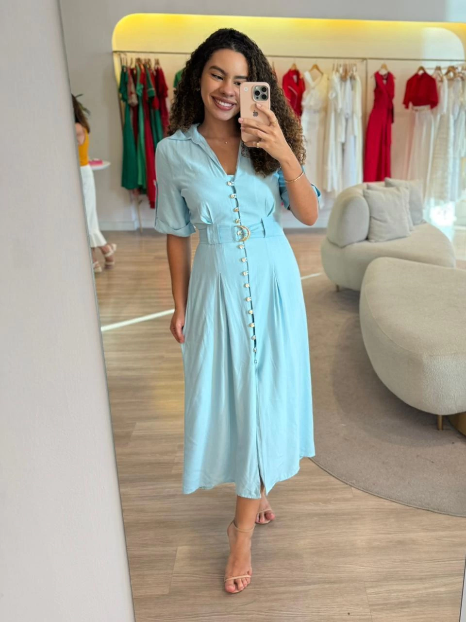 A chemise em tecido estruturado, com botões e faixa, é a escolha certa pra um look elegante e cheio de presença.