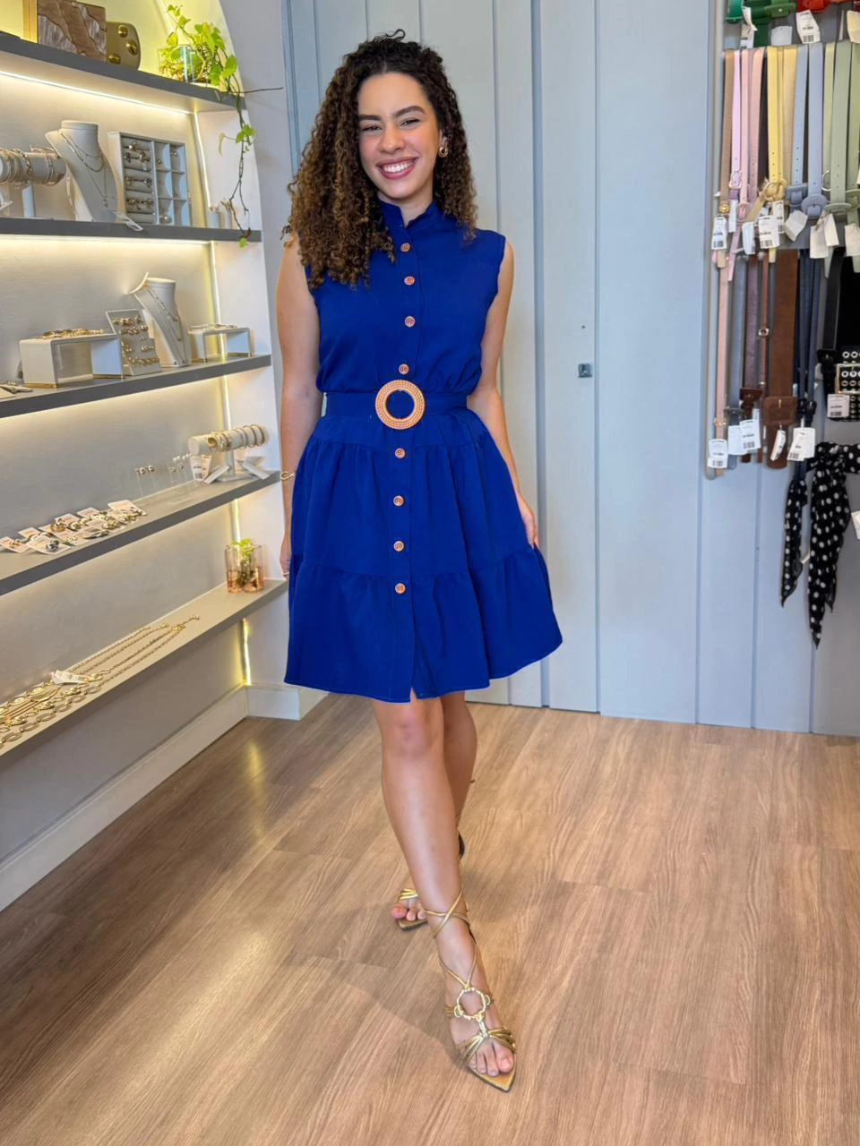 Vestido em crepe de algodão, com botões funcionais, regata ideal para várias ocasiões, acompanha faixa.