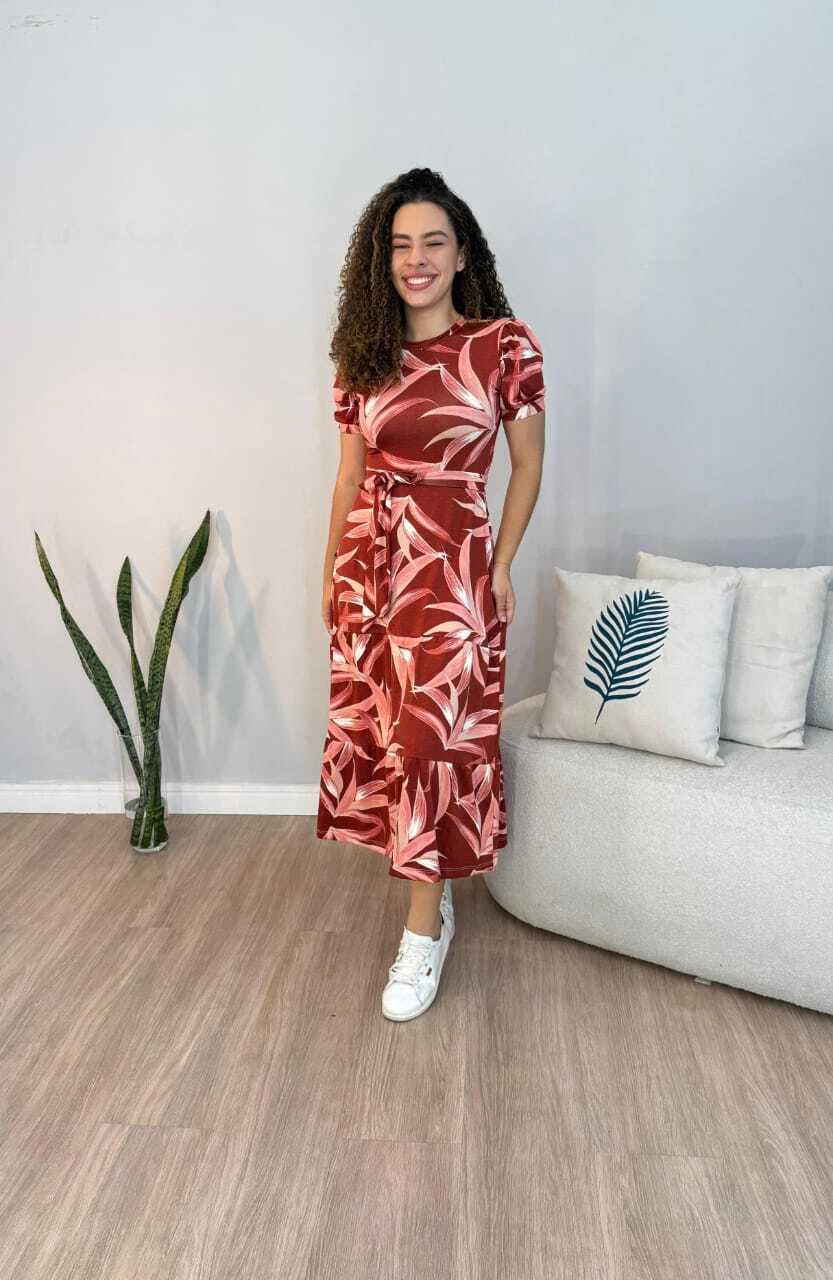 Frescor e estilo no mesmo look! O vestido midi em malha estampada com mangas é a pedida perfeita para dias leves e cheios de movimento.