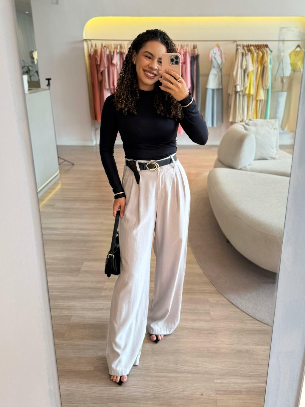 Calça pantalona, um modelo que une estilo e conforto. Com bolsos nas laterais, ela é ideal para compor looks casuais ou sofisticados. O botão traz um toque elegante, tornando-a perfeita para diversas ocasiões.