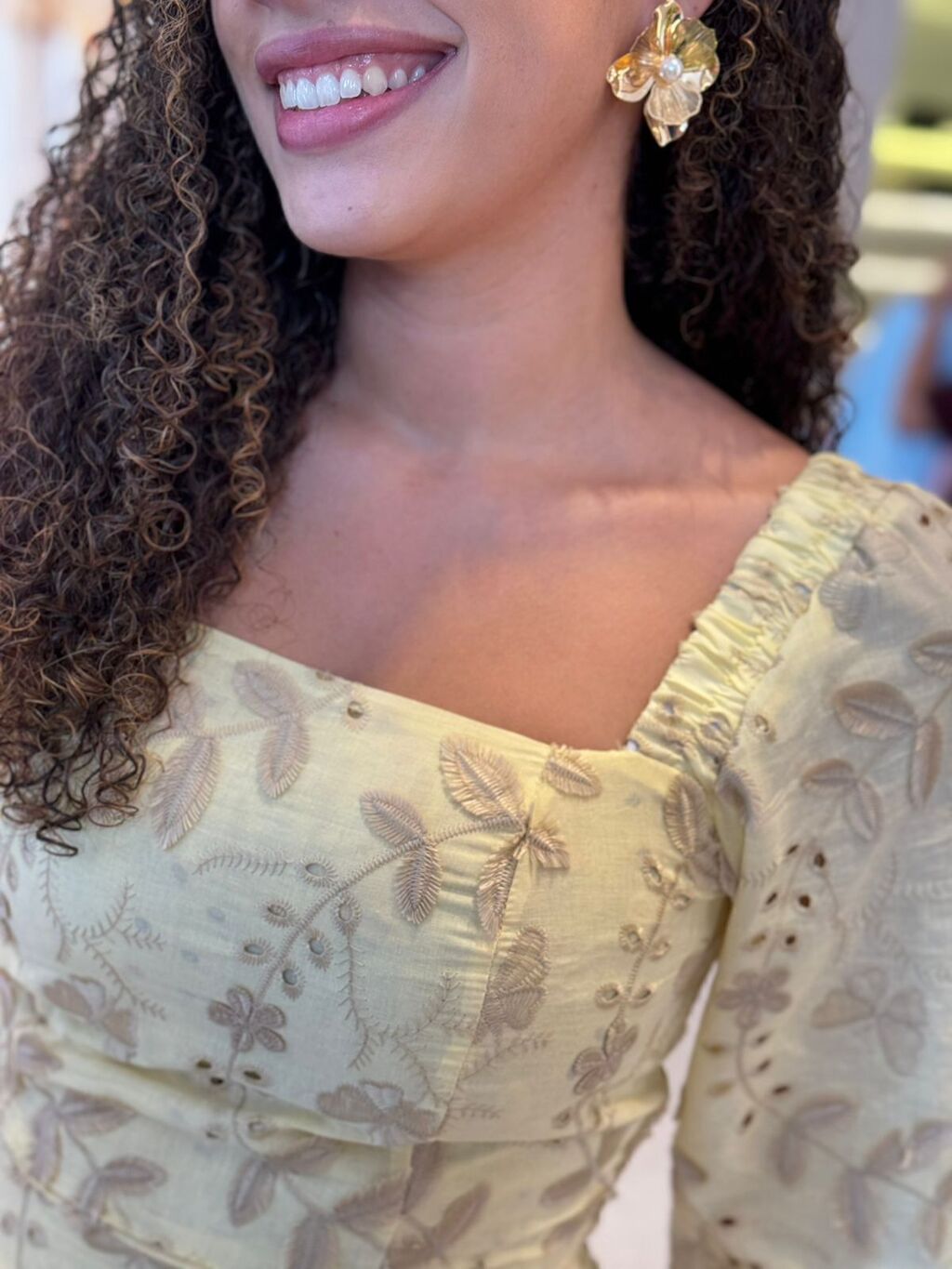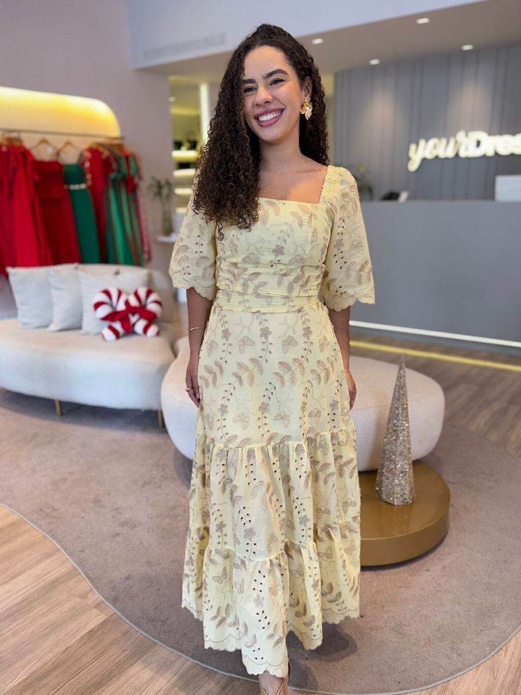 O tom suave de amarelo traz leveza e frescor — ideal para dias ensolarados ou eventos diurnos em que você quer estar elegante sem abrir mão do conforto.